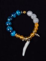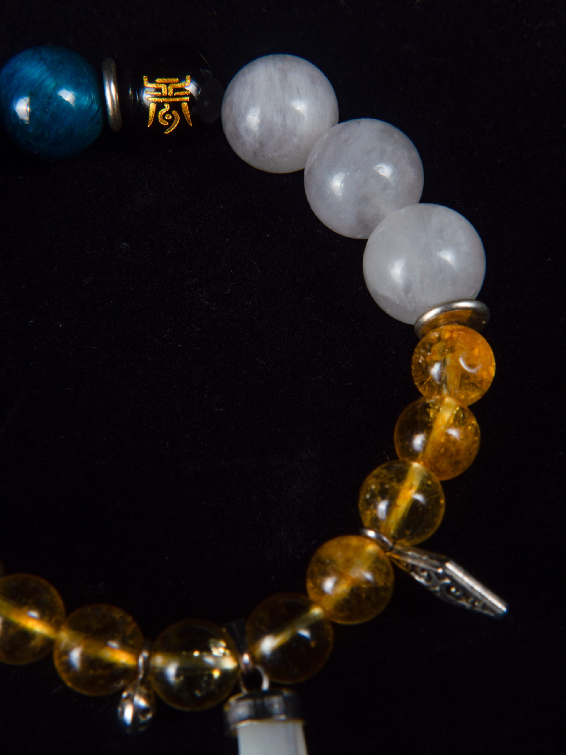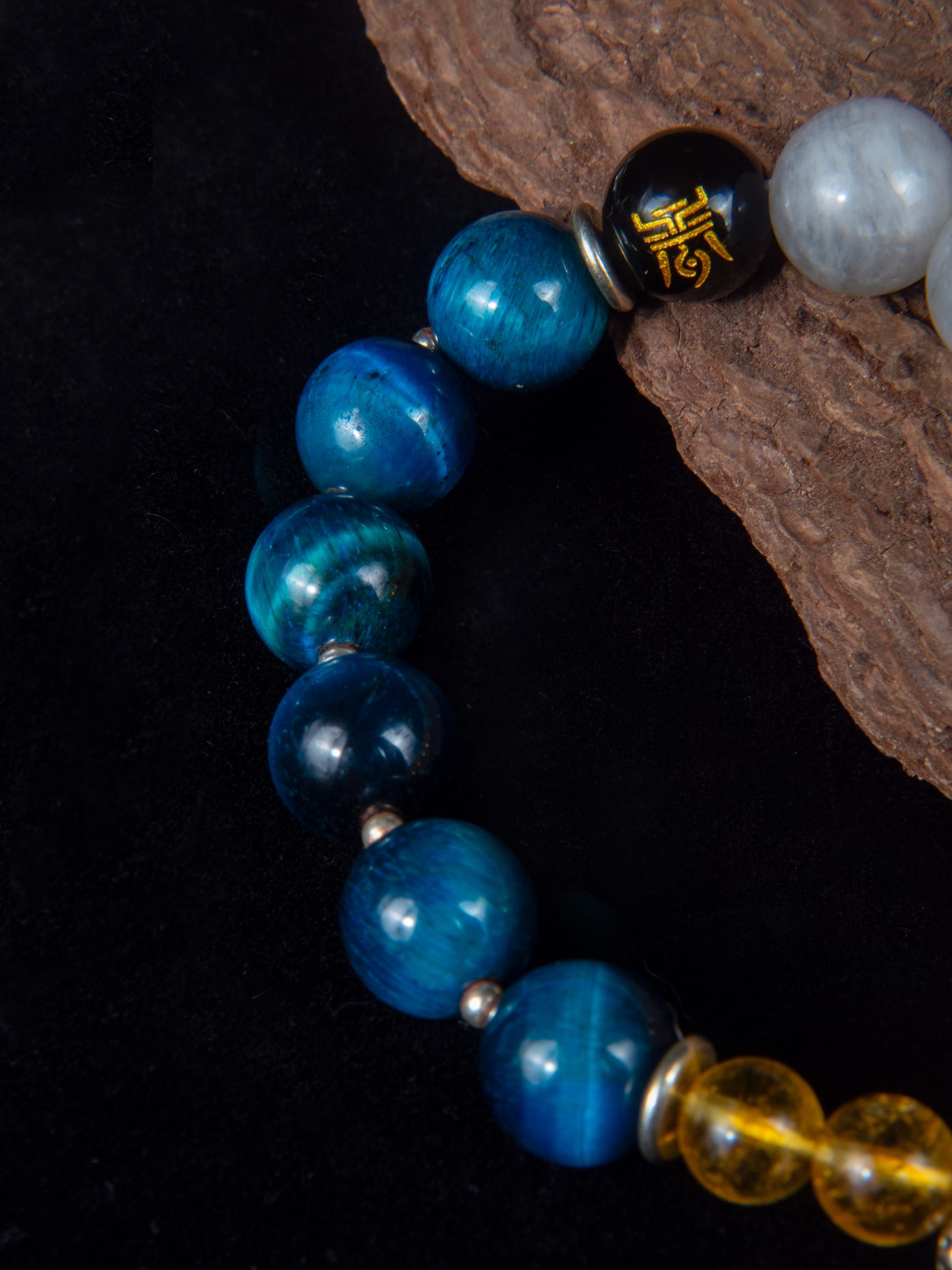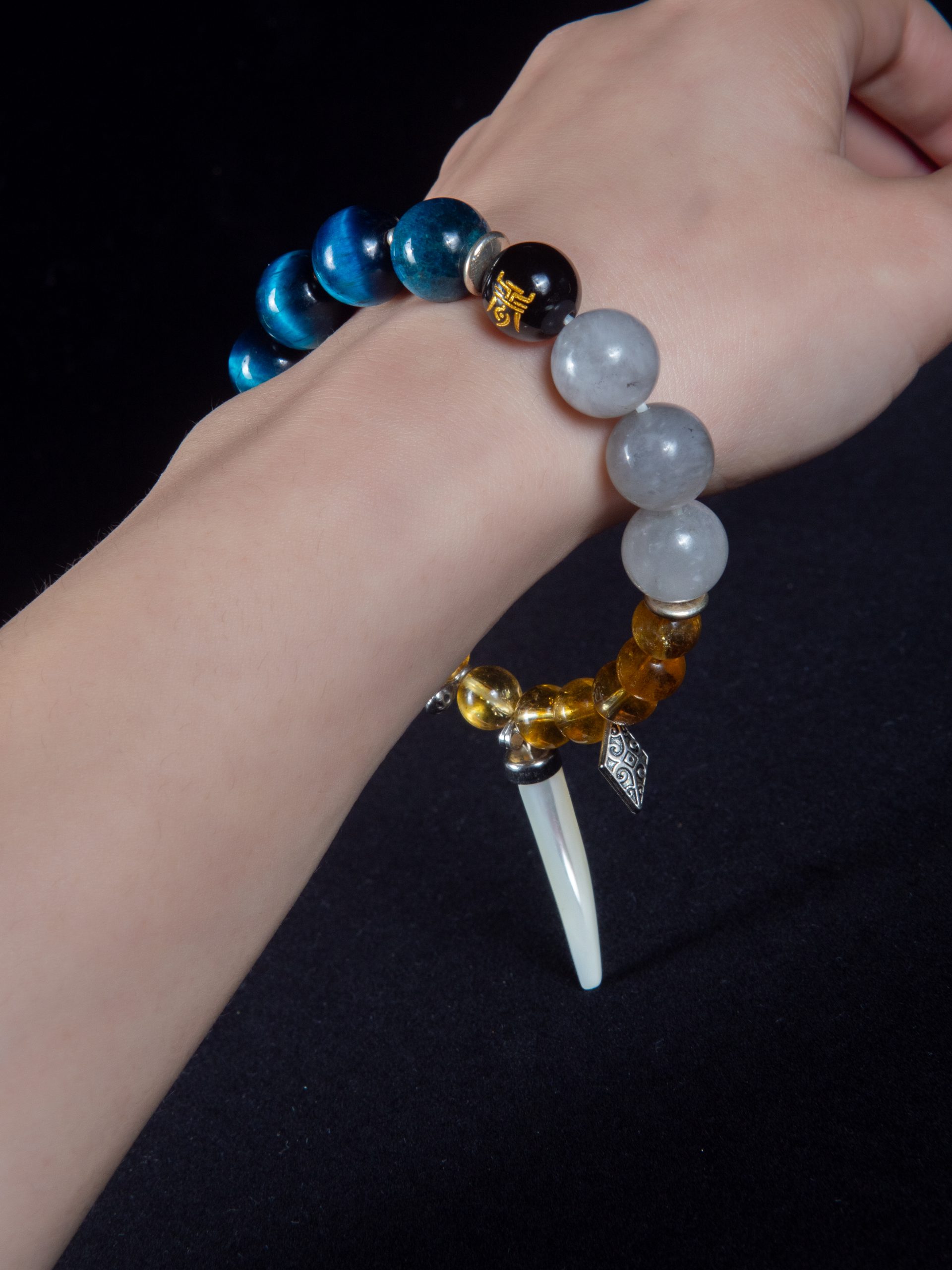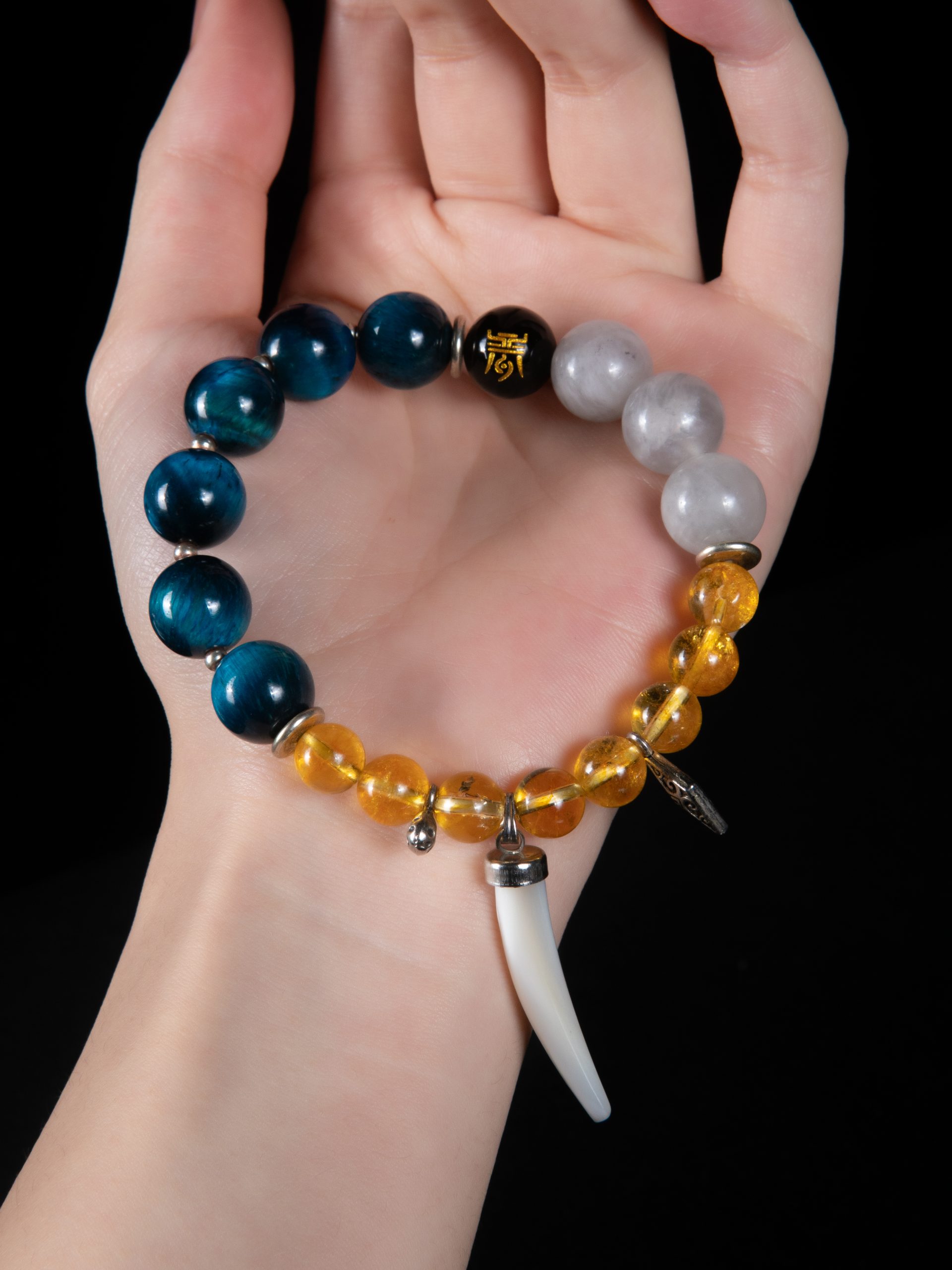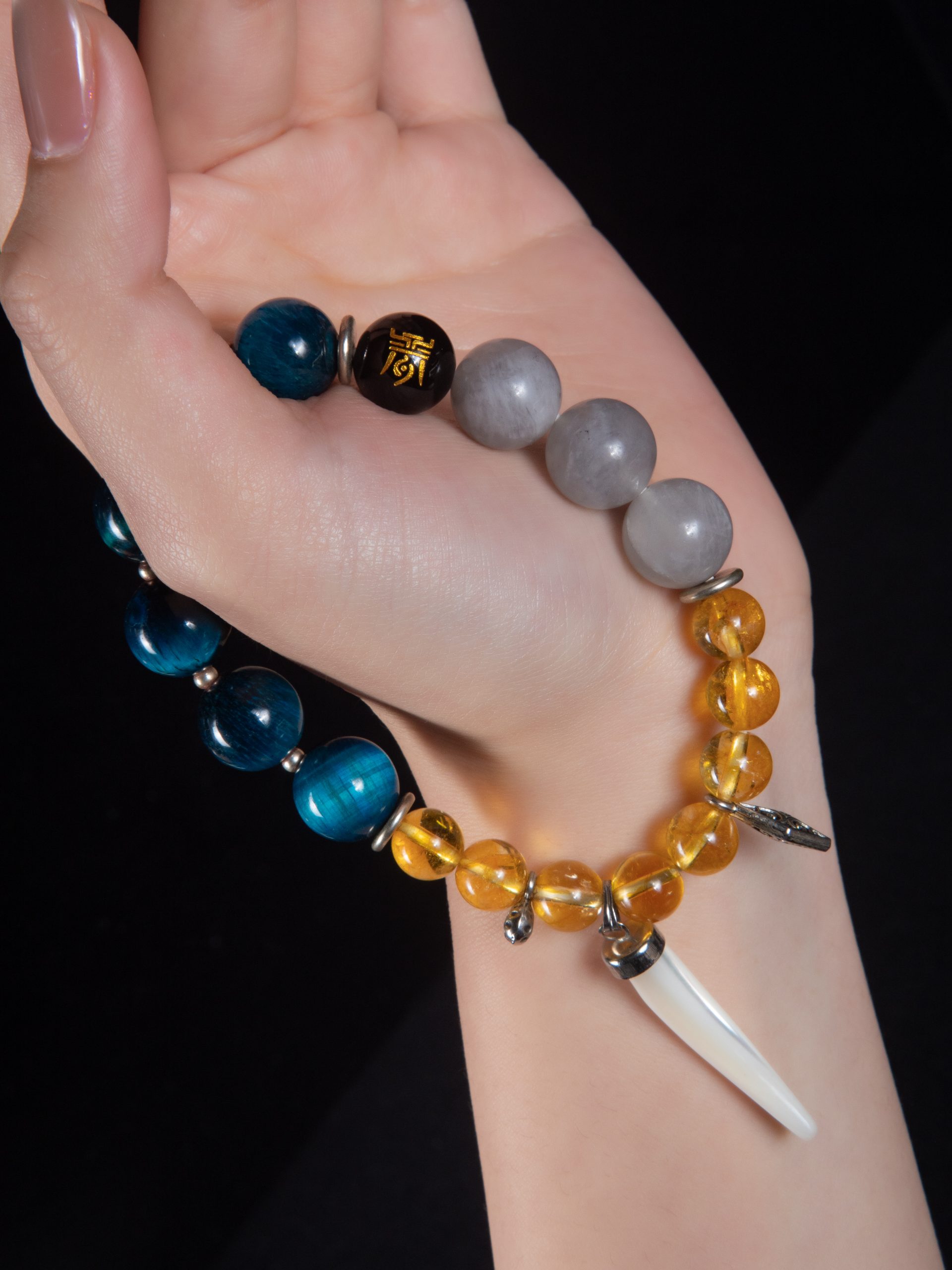 This bracelet draws inspiration from Yue school (Cantonese) architecture of Xiguan, Guangzhou. Its layered bead arrangement echoes the curved roof ridges and latticework of Xiguan mansions, while the deep blue of Blue Tiger’s Eye and golden Citrine mirror the classic contrast of dark roof tiles and warm wooden beams in traditional Lingnan buildings. The totem and crescent pendant also pay homage to local folk beliefs, which use moon motifs and protective symbols to invoke divine guardianship and positive energy.