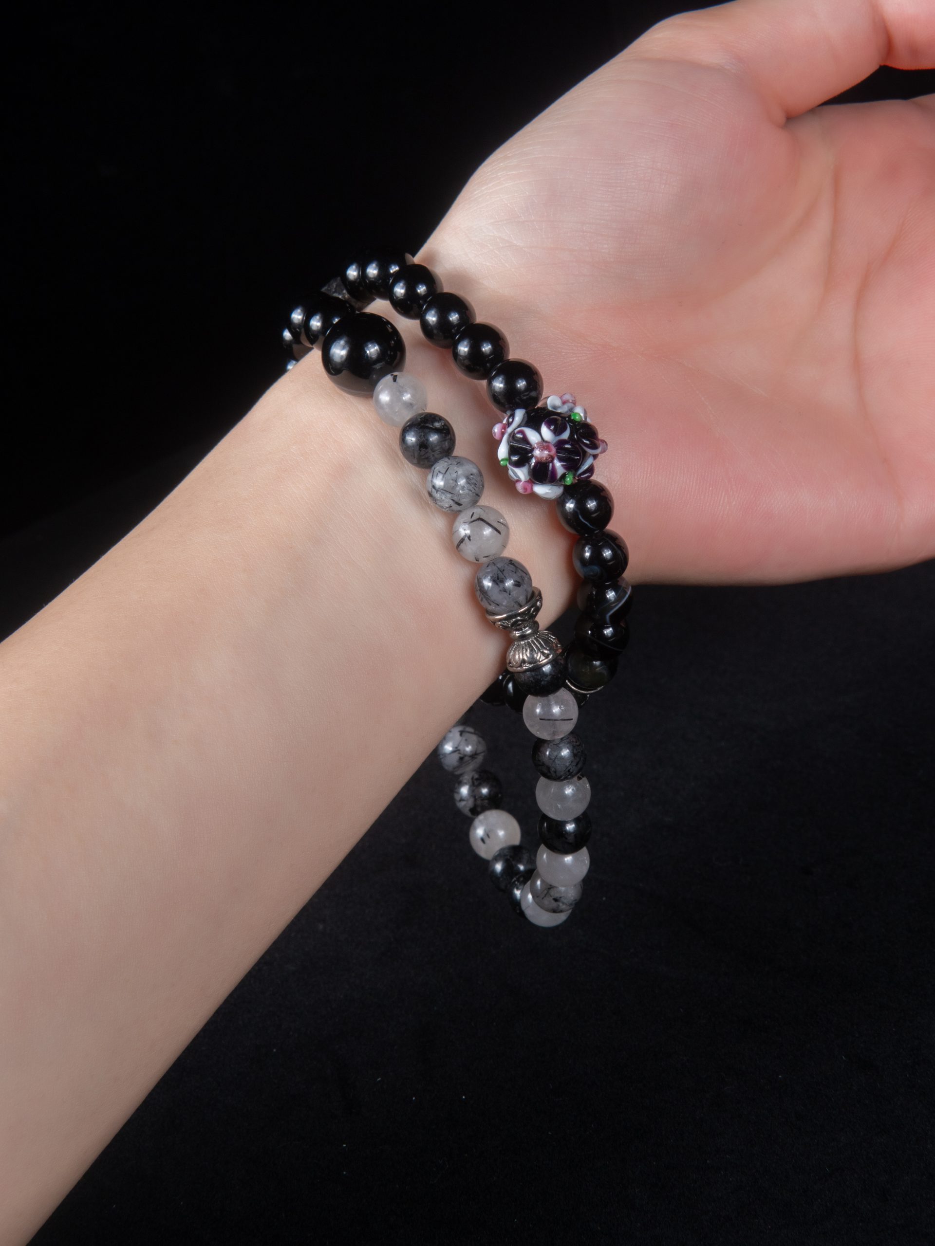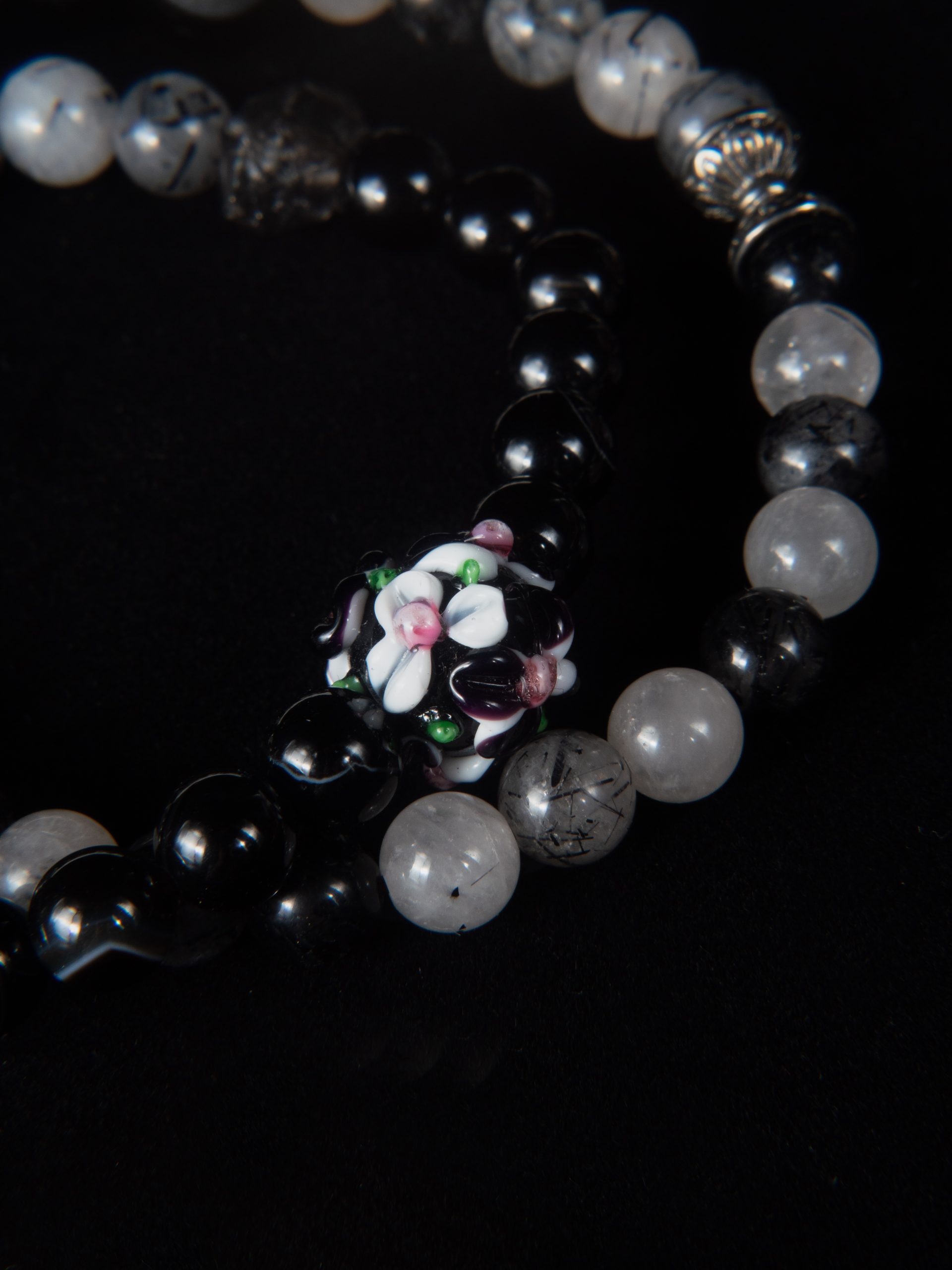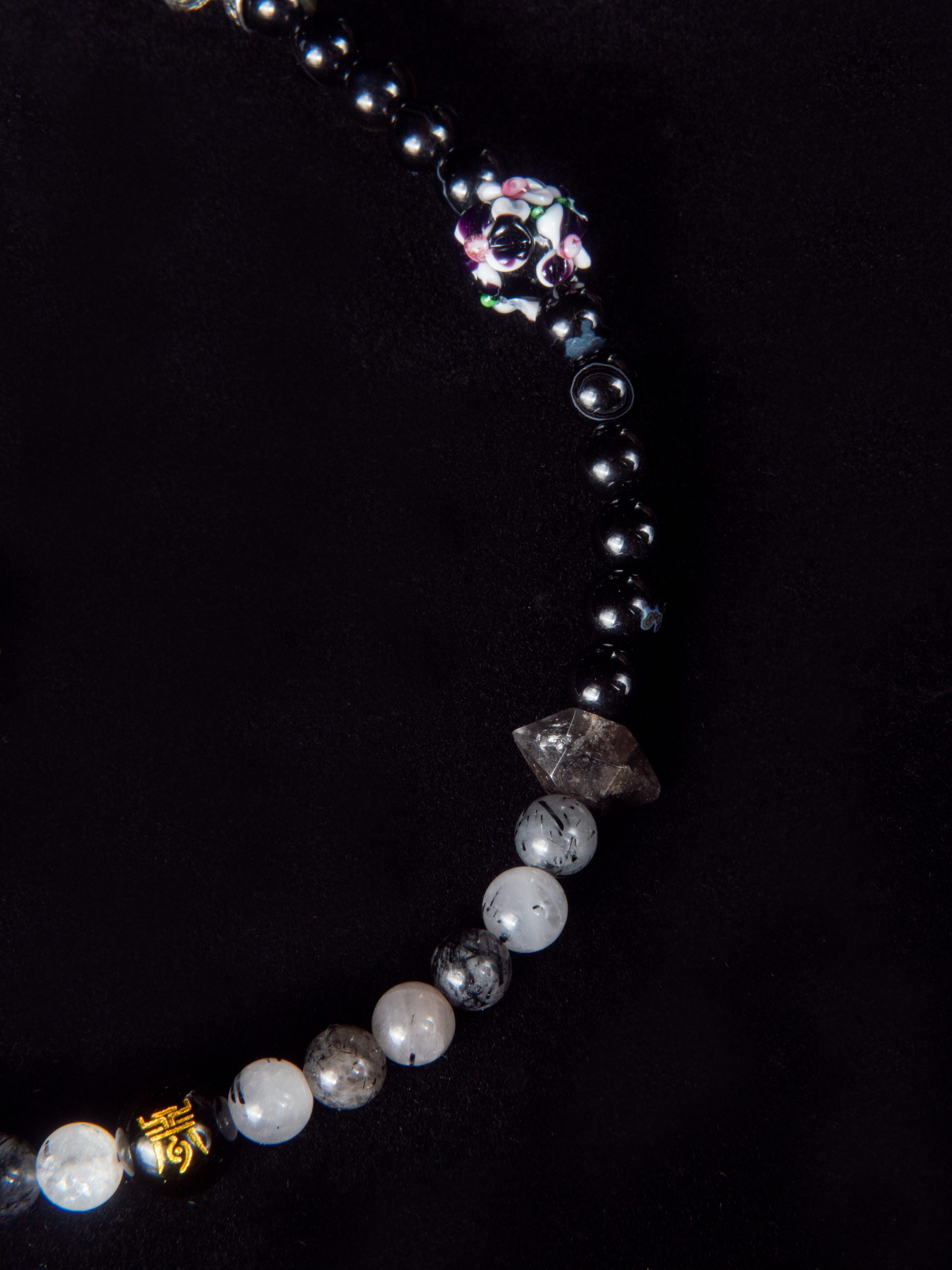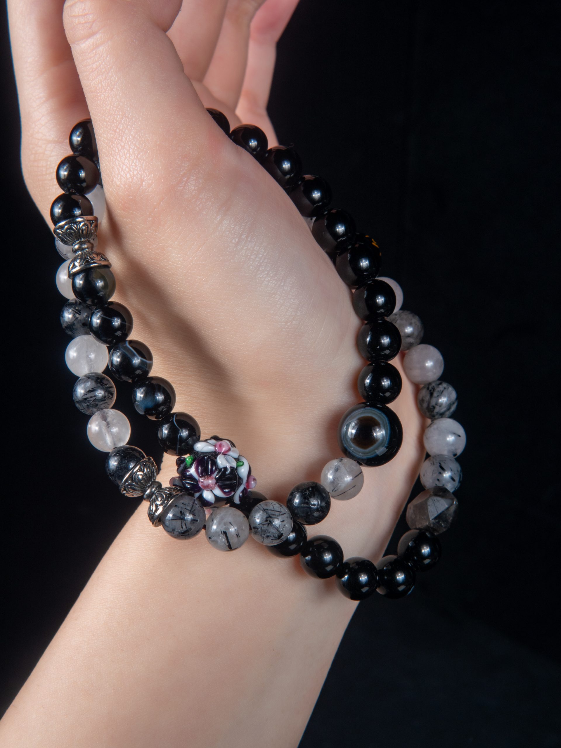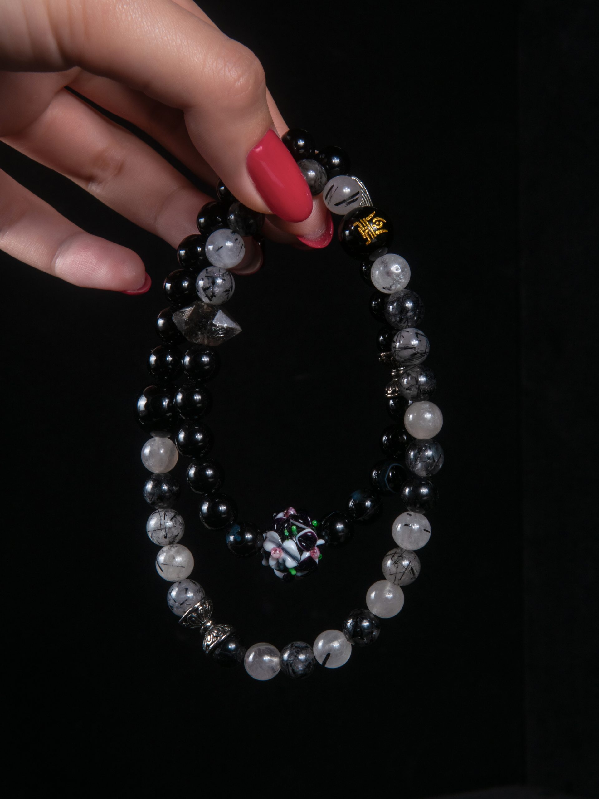 The deep, dark hue of black rutilated quartz mirrors the calm backdrop of twilight; the smooth, polished sheen of black agate accentuates a sleek and refined silhouette; the subtle sparkles of herkimer diamond twinkle like tiny stars scattered across the night sky. The delicate decorative details hold a tender implication of protection, exuding a serene and reassuring energy of their own.