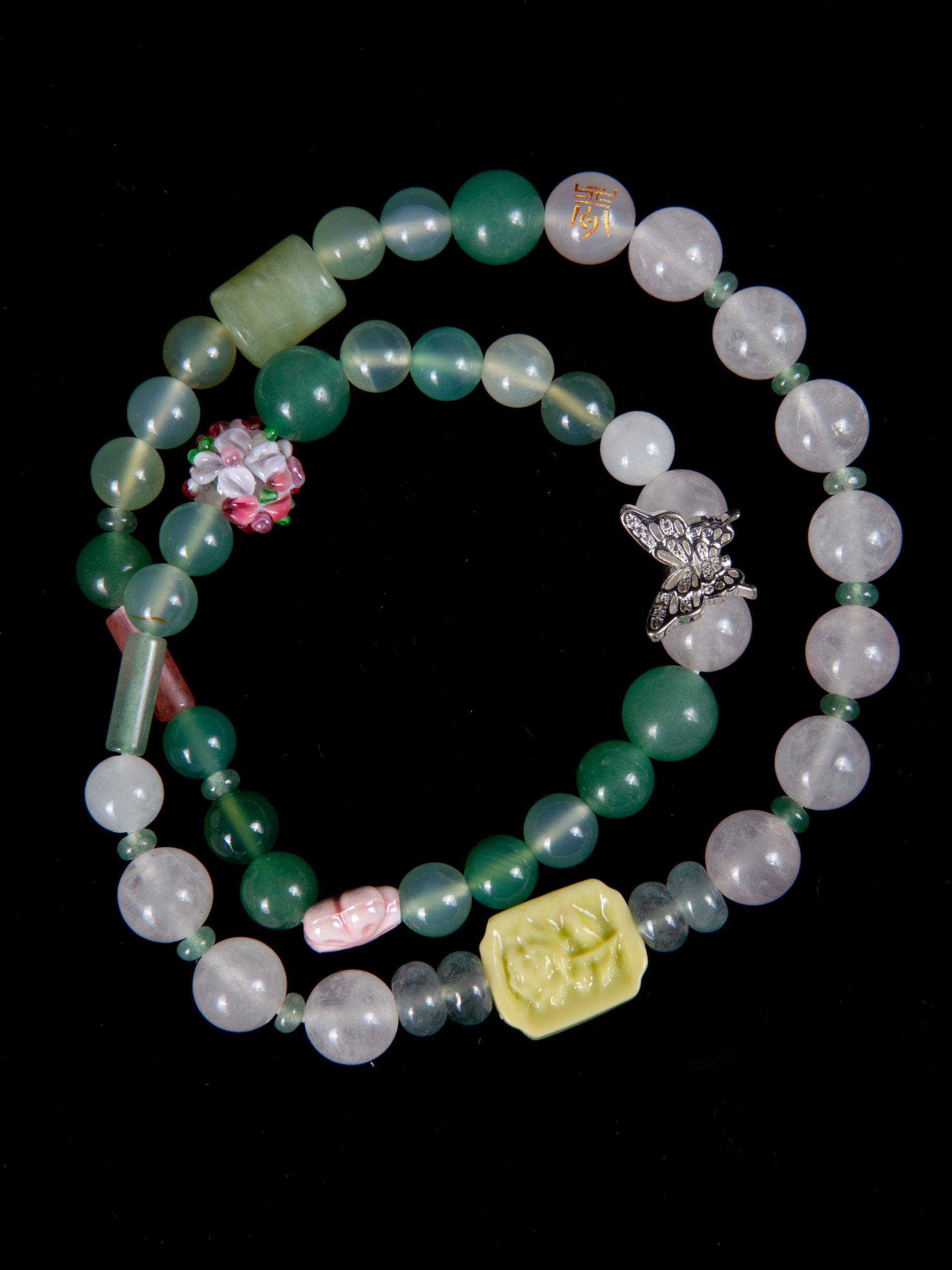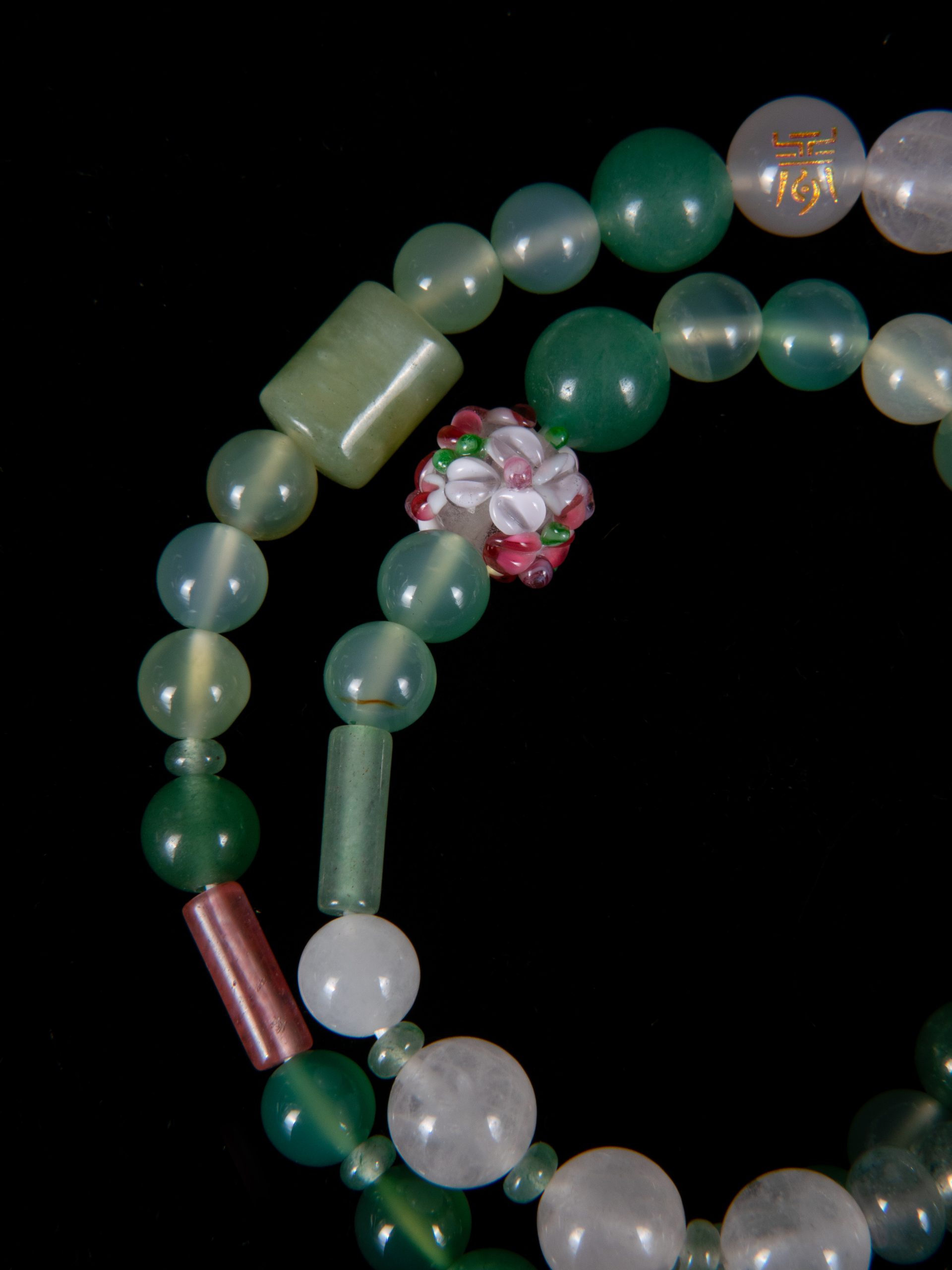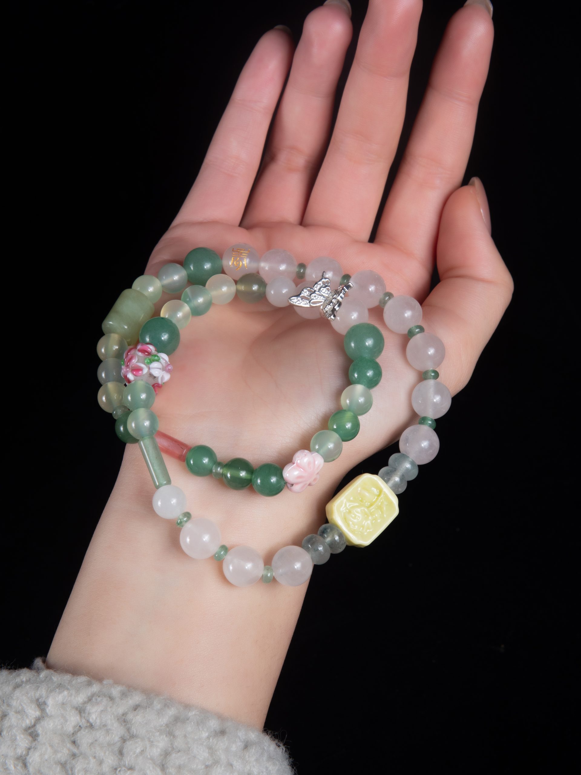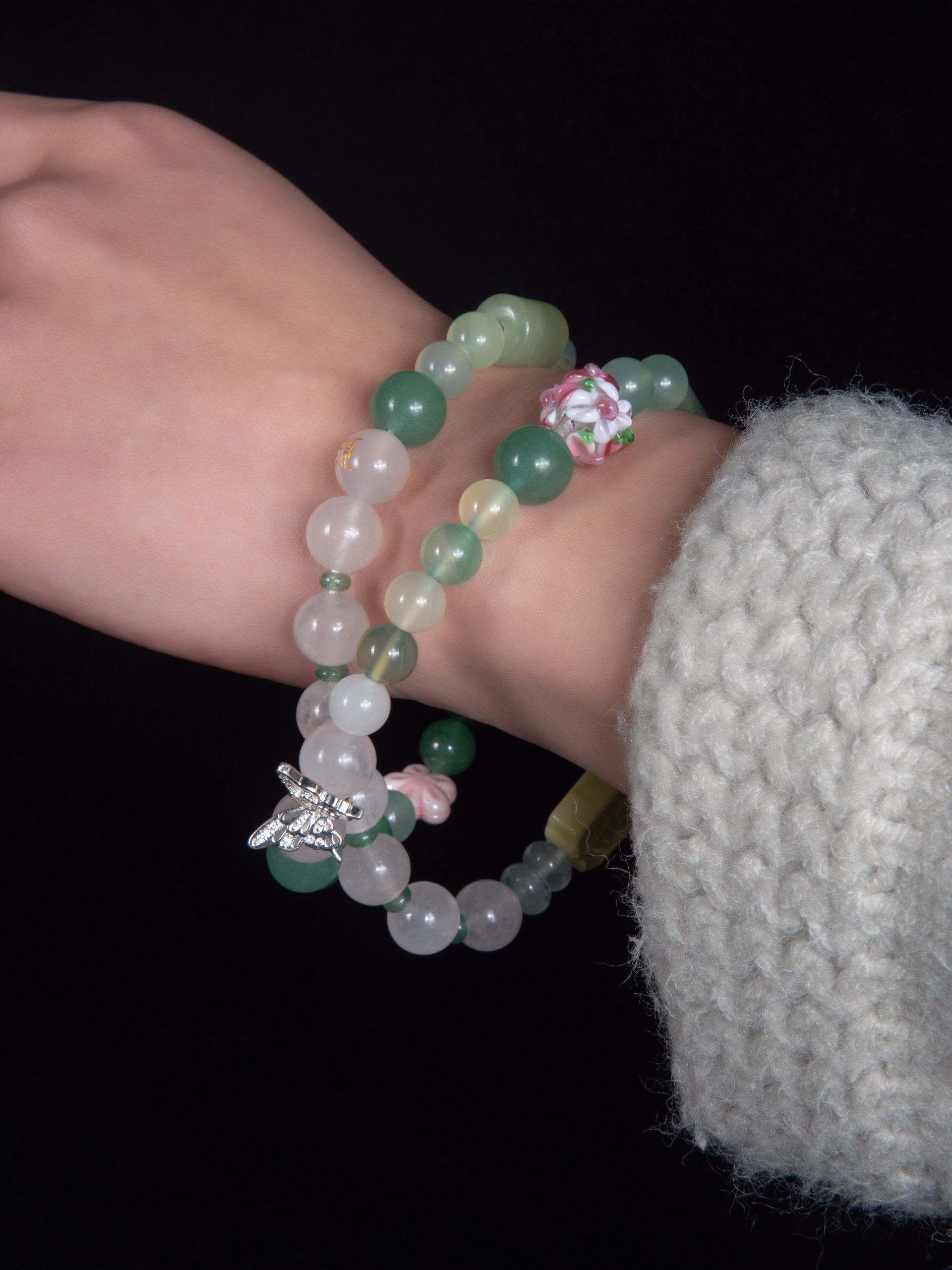 This “Gathering Greenery on the Flower Path” Double-Loop Bracelet** is crafted with Rose Quartz, Green Aventurine, light green Agate, and White Chalcedony, accented with pink shell flowers, a silver butterfly charm, and a pressed flower plaque, condensing the soft beauty of a spring floral path onto your wrist. The double-loop design fits wrists 15–18cm, sitting lightly and comfortably. The sweet pink of Rose Quartz, vibrant green of Green Aventurine, and warm luster of Agate interweave to create the lively spring vibe of *”Gathering Greenery on the Flower Path”*, making it a striking highlight for both daily commutes and spring outings.
