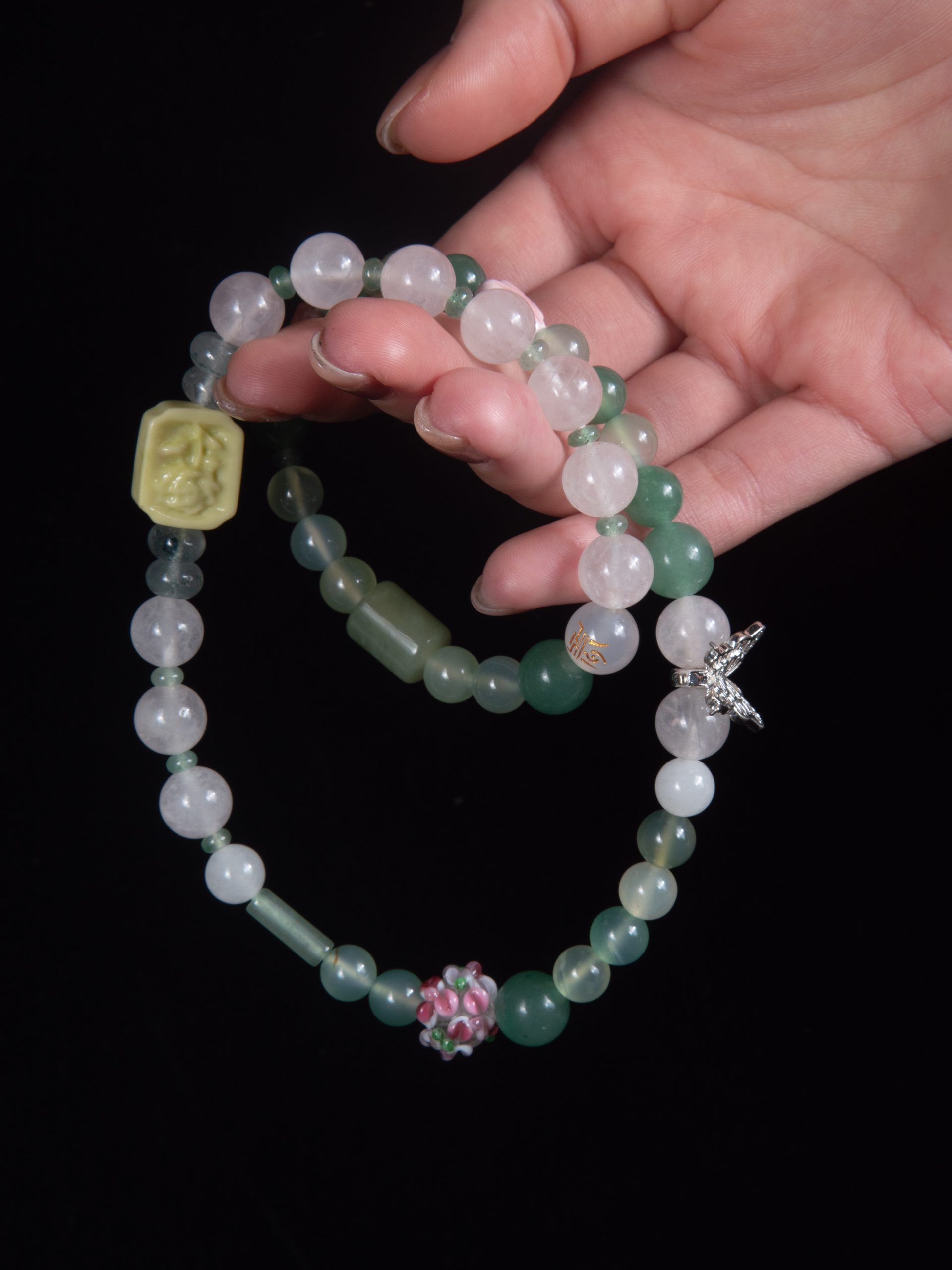 Inspired by the traditional Chinese Flower Festival, this design evokes the vibrant charm of a spring floral path: Rose Quartz resembles budding peach blossoms, Green Aventurine like grass by the trail, and light green Agate like fresh shoots. The pink shell flowers echo the fragrance of “gathering greenery”, the silver butterfly charm hints at the romance of “flowers and butterflies accompanying each other”, and the pressed flower plaque carries the wish of “welcoming blessings in spring”, turning the bracelet into a portable spring talisman. Rose Quartz attracts popularity, Green Aventurine boosts vitality, and White Chalcedony stabilizes emotions — these three energies, like warm spring sunshine, offer gentle and healing companionship.