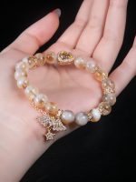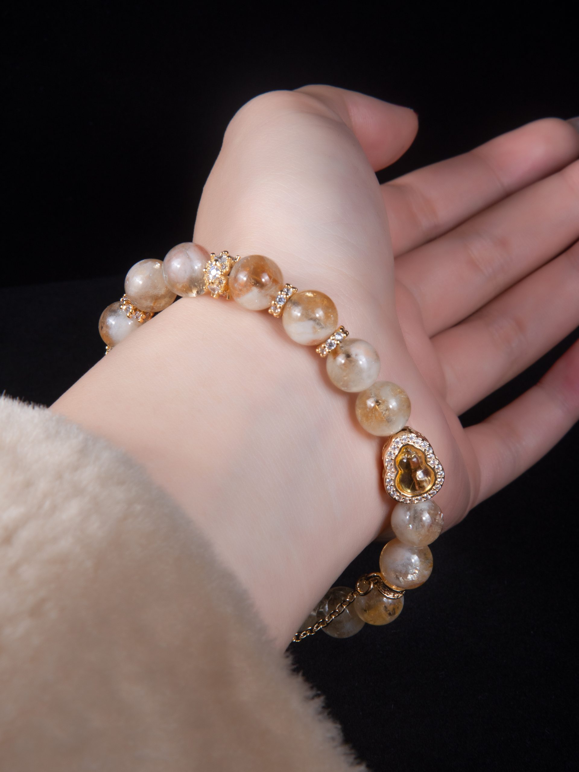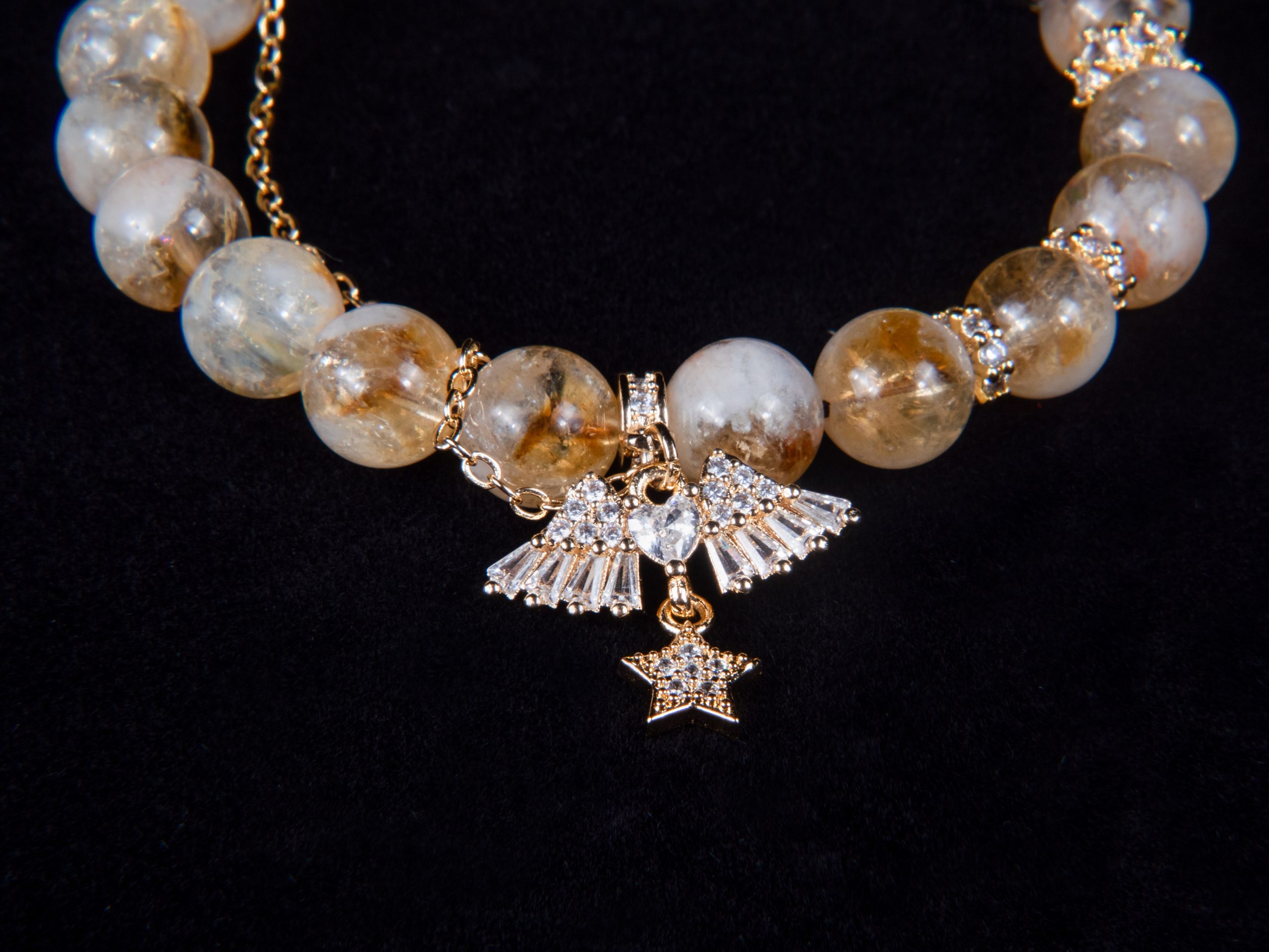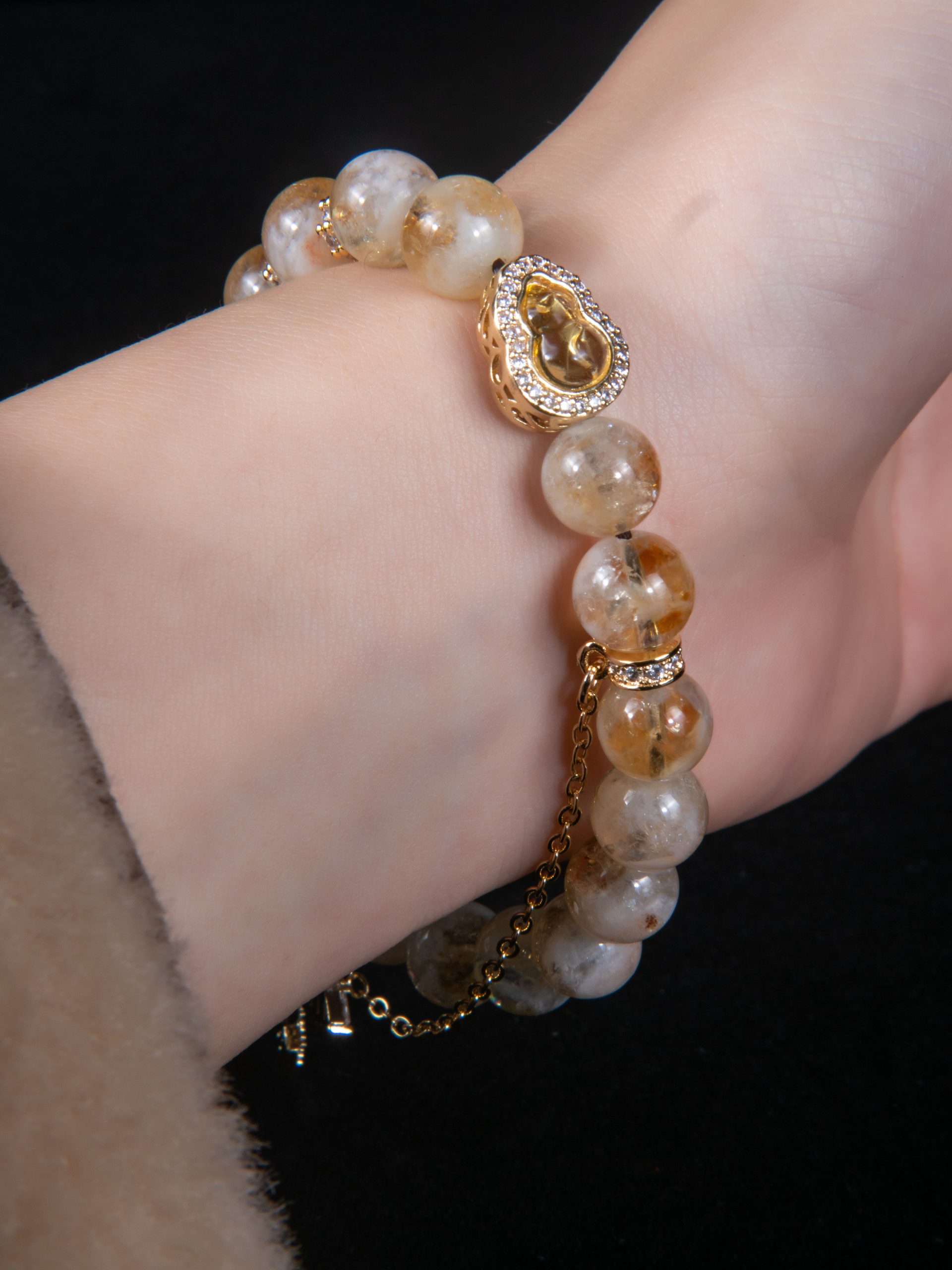 金天使的核心为10毫米黄水晶珠,透明水晶如散射阳光般自然质感。装饰品由镀金的葫芦形黄水晶饰品点缀,搭配镶嵌锆石的翅膀吊坠和星形吊饰,营造出温暖、闪耀的轻奢美感。可调节尺码,适合15-18厘米手腕佩戴,既可单独佩戴以彰显细腻魅力,亦可与其他细链叠加叠放,层叠造型,为你的装扮注入温柔而赋能的能量。